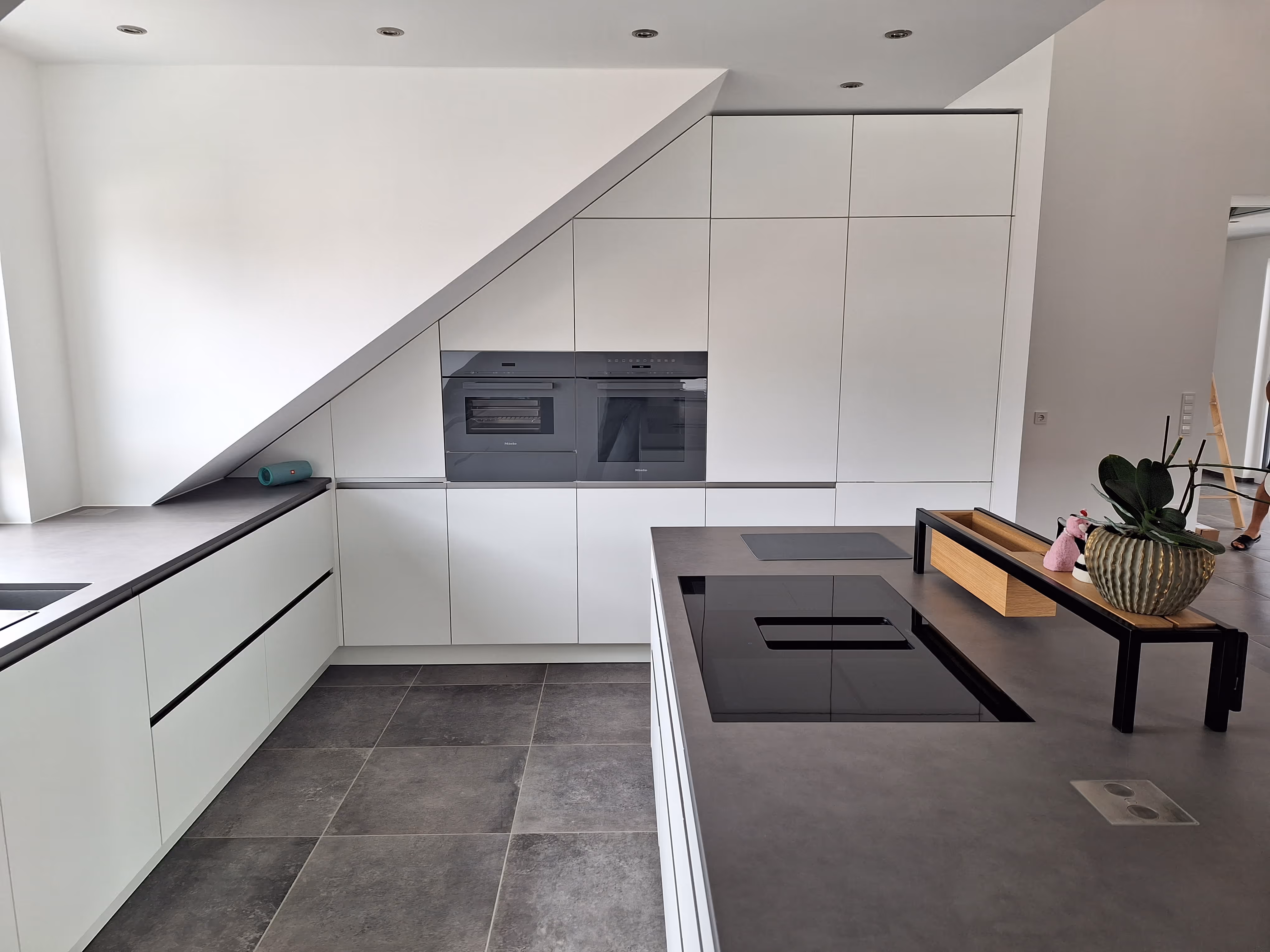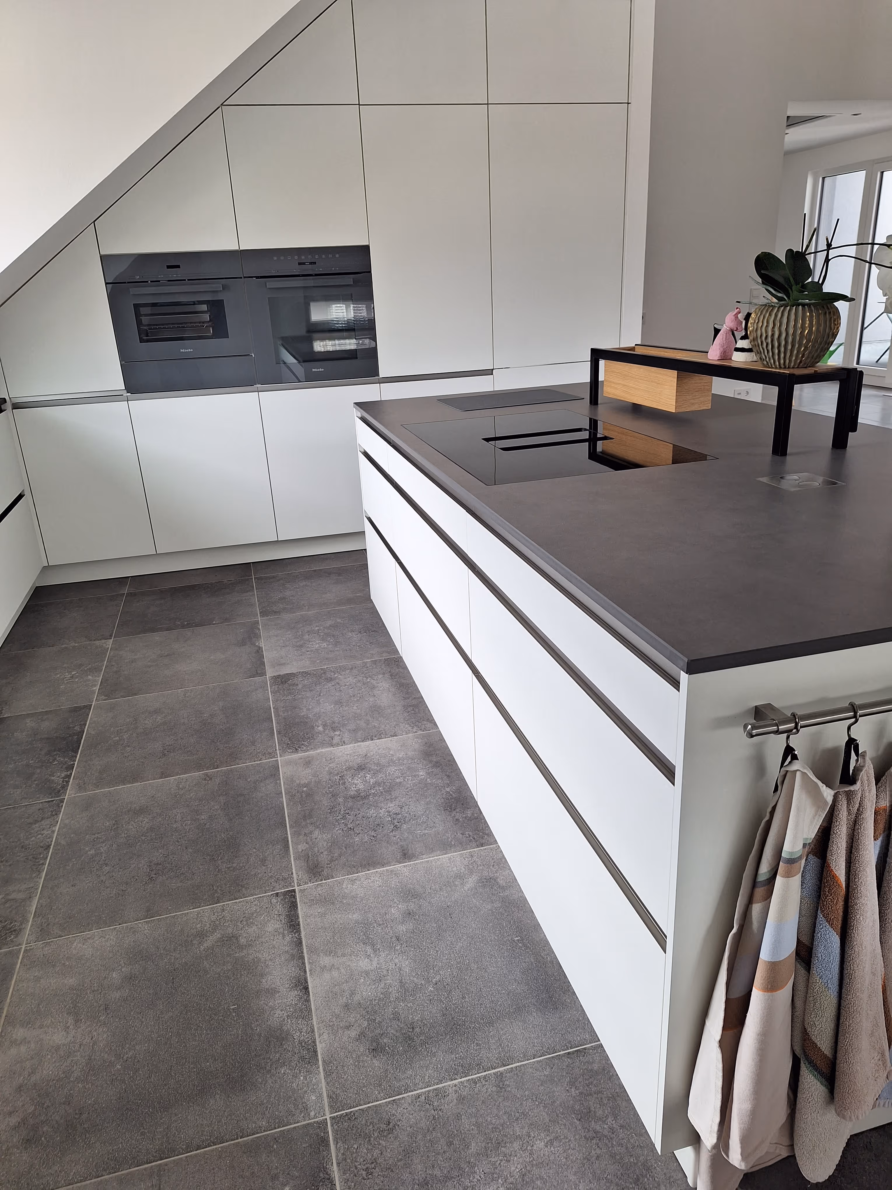 Dachschrägen und verwinkelte Grundrisse erfordern keine Kompromisse, sondern kreative Lösungen. Bei diesem Projekt verwandelt sich der Raum unter dem Dach in ein lichtdurchflutetes Koch-Erlebnis. Das Ziel war es, eine puristische Designsprache zu etablieren, die Ruhe ausstrahlt und gleichzeitig den vorhandenen Raum bis in den letzten Winkel effizient nutzt. Die Kombination aus strahlendem Mattweiß und dunklen Akzenten in Anthrazit verleiht der Küche eine zeitlose Eleganz, die den Raum optisch weitet und strukturiert.
